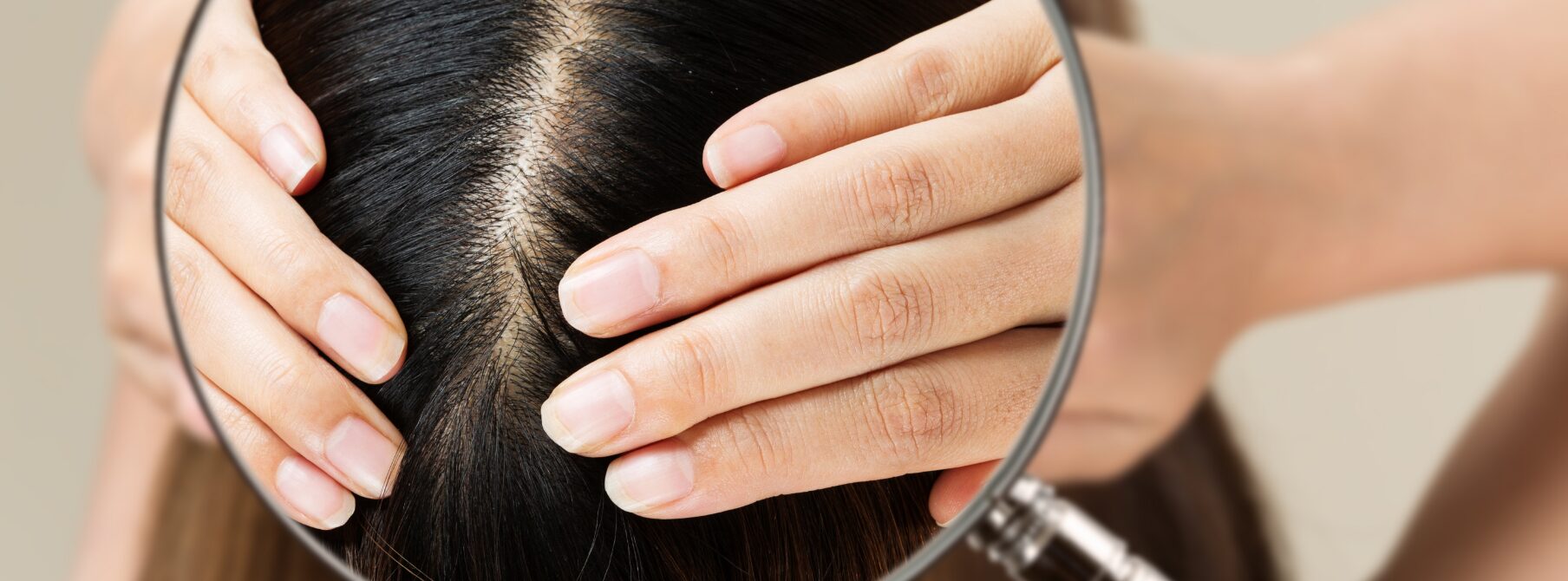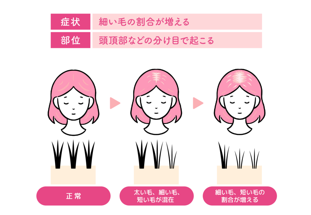 髪の軟毛化に伴い、頭頂部や分け目を中心に薄毛が進行するのが特徴です。