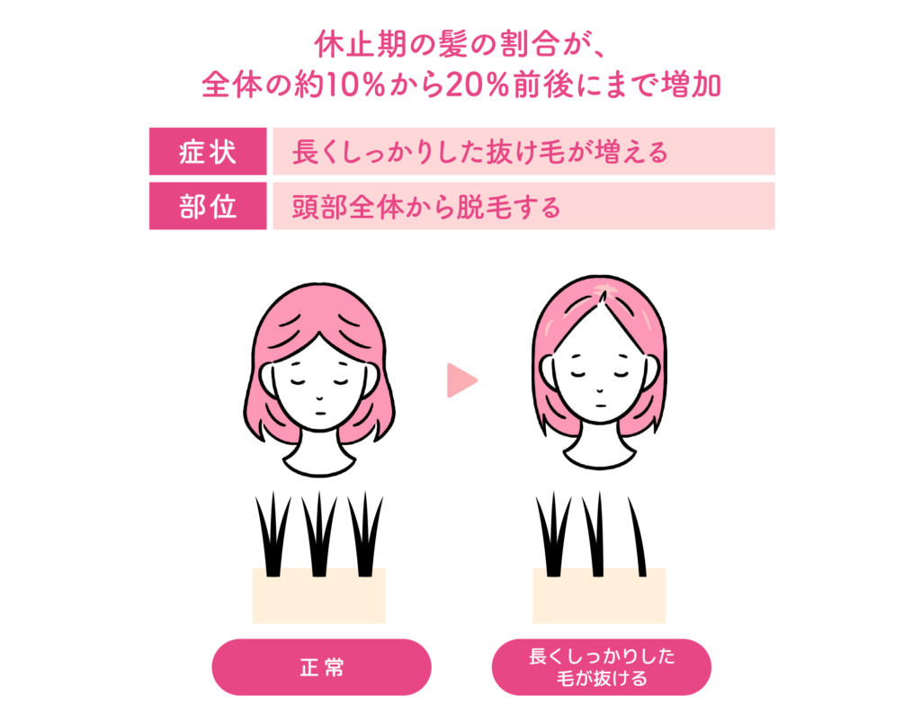 本来は全体の約10%ほどである休止期の髪の割合が、20%前後にまで増えるようになり、結果として抜け毛が一度に増えます。男性型脱毛症のように短く細い軟毛が抜けるのではなく、長くしっかりした抜け毛が増えるのが特徴です。その結果、頭髪全体のボリュームが徐々に減っていきます。